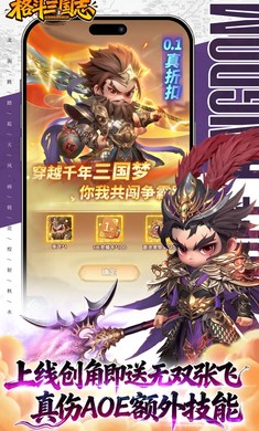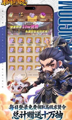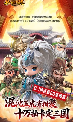 【混沌张飞】上线创角即送混沌武将,无双张飞,真伤AOE,额外技能! 【在线送T0】首日在线,送无双英雄,上将黄忠,直送8星! 【20星无双】14日登录送20星无双黄忠,本体狗粮全包,免费养成! 【100000抽】每日登录免费领取高级求贤令,总计赠送十万抽! 【7日庆典】7日任务免费送20星上将马超,五虎上将免费得三 【每日签到】每日签到送通用全系灵魄,狗粮不愁! 【每日五千充值】1毛不到激活双月卡,每日领5000元充值卡! 【元宝保值】赠送大量元宝,超绝购买力,Q萌三国畅行无阻